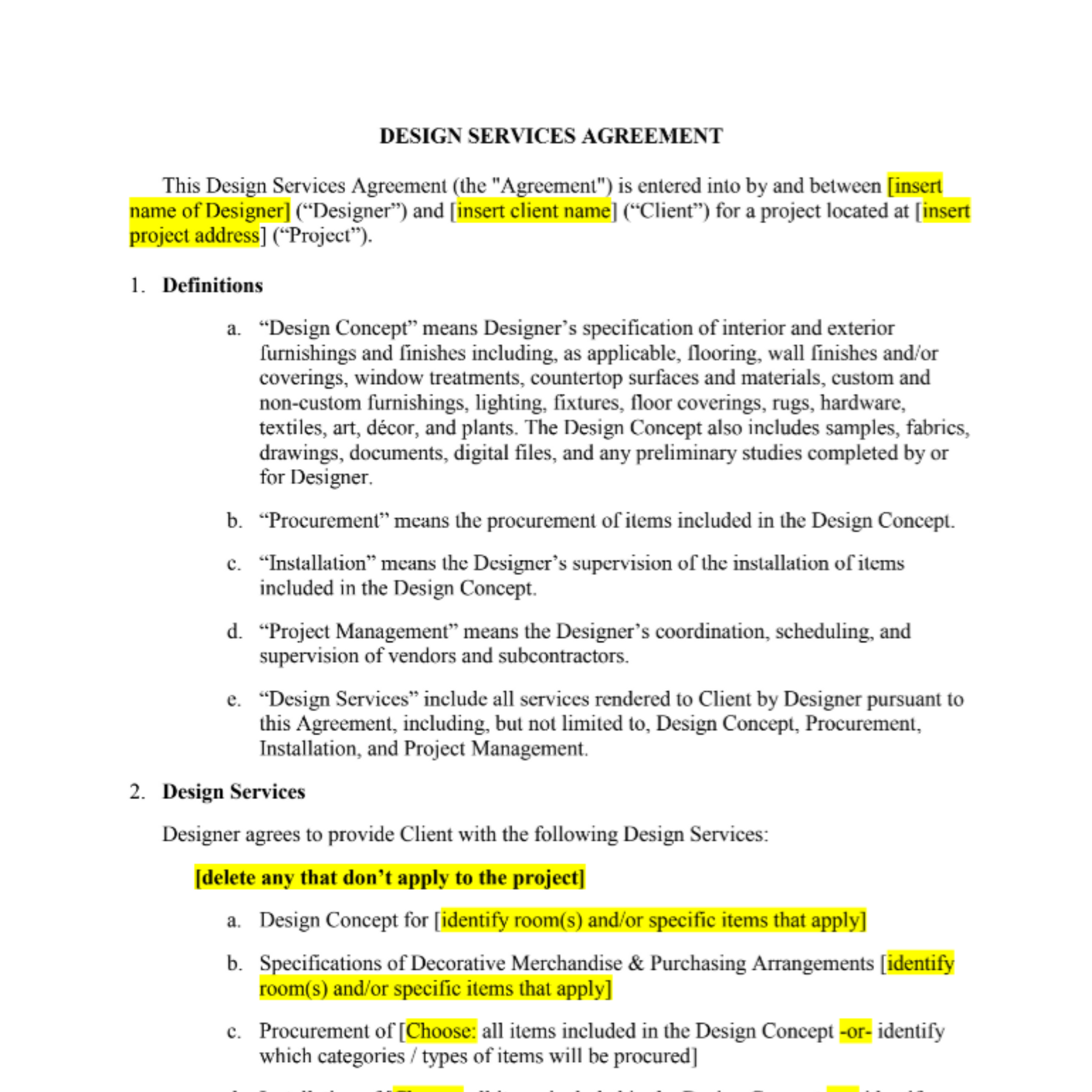 An interior designer or decorator has a multi-faceted job with a lot of moving pieces - technical design, overseeing contractors, artistic design, and sourcing materials. Managing client expectations and making sure everyone is on the same page on the front end can help ensure your project is smooth sailing. The Interior Design Services Agreement answers questions like: