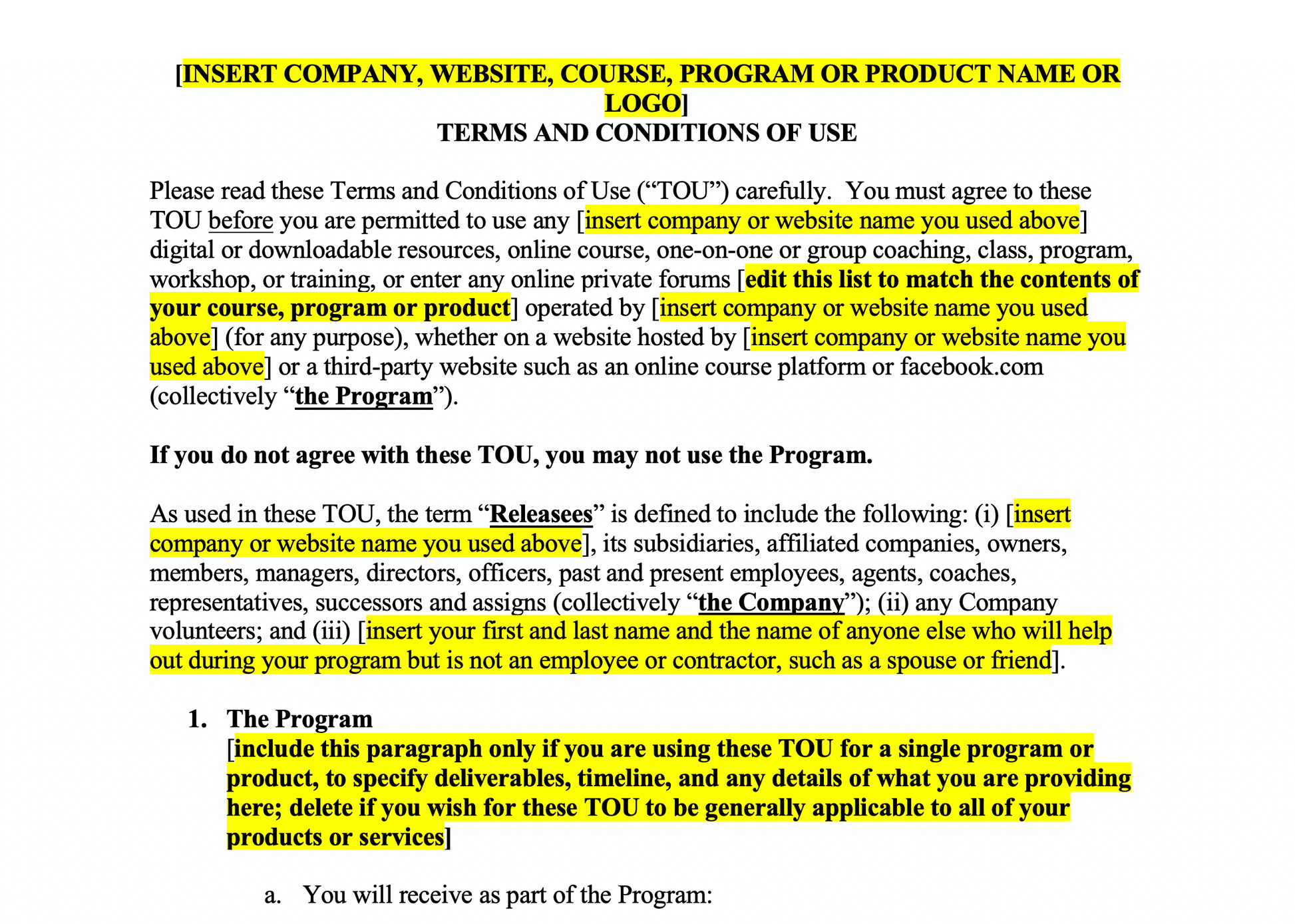 We wrote these documents specifically for creative entrepreneurs – online educators, coaches, podcasters, bloggers, YouTubers, designers, photographers, and other creatives. They might not work as well for a brick and mortar pizza shop or boutique, but they are already pre-customized to fit your online, creative business.